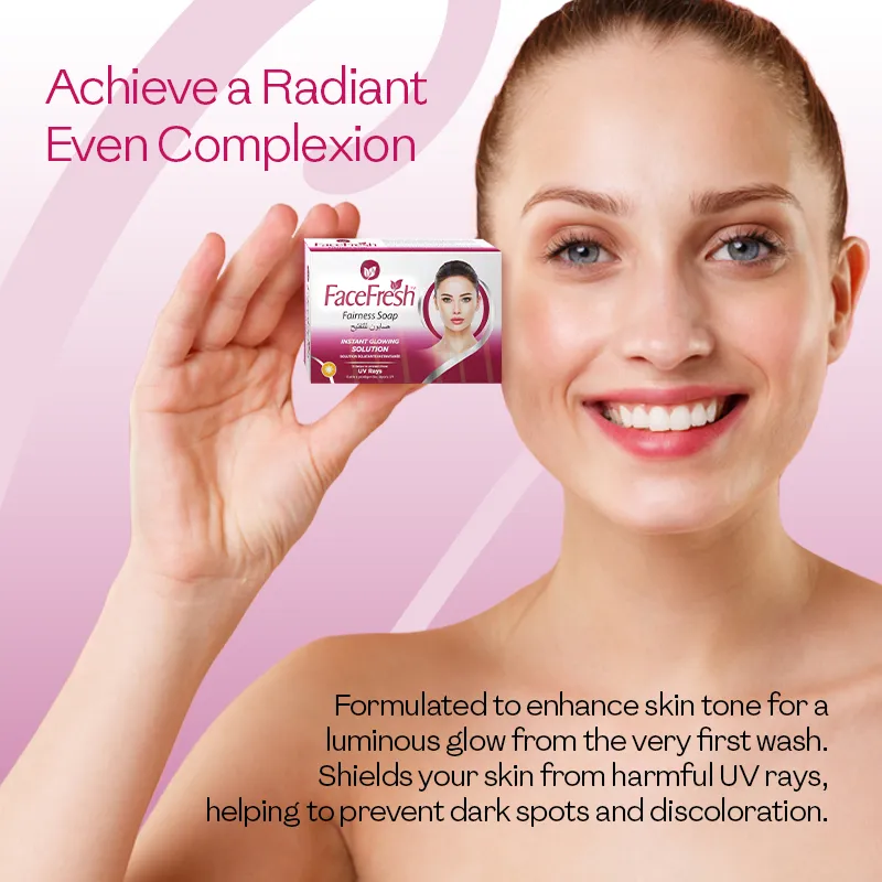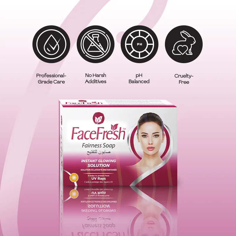 Face Fresh Fairness Soap whitens, smooths, and refreshes skin. Gentle on all skin types. Use twice daily for soft, glowing skin and a clean, fresh feel.