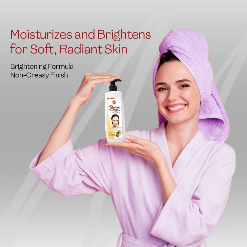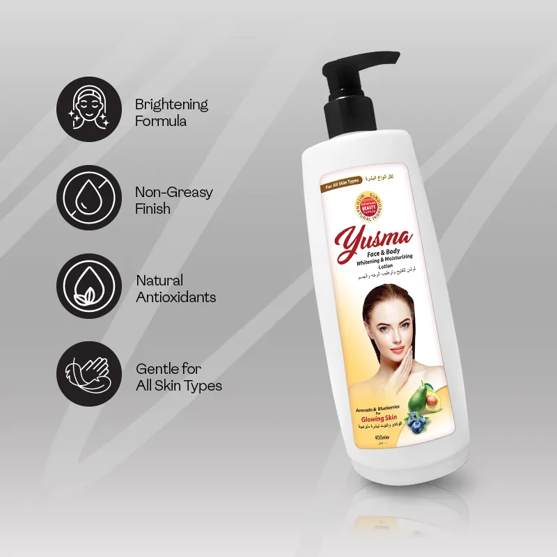 Yusma Whitening Lotion hydrates, nourishes, and improves elasticity. Enriched with avocado and blueberry for soft, glowing skin. Use daily for long-lasting moisture and beauty.